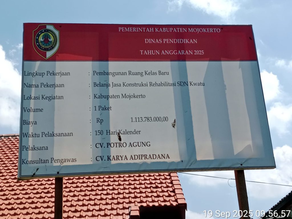 Salah satu lembaga pendidikan yang mendapatkan jasa kontruksi rehabilitasi adalah SDN Kwatu, Kecamatan Mojoanyar, Kabupaten Mojokerto. Tidak tanggung-tanggung, dana untuk rehabilitasi sekolah tersebut senilai Rp.1.113.783.000,00.