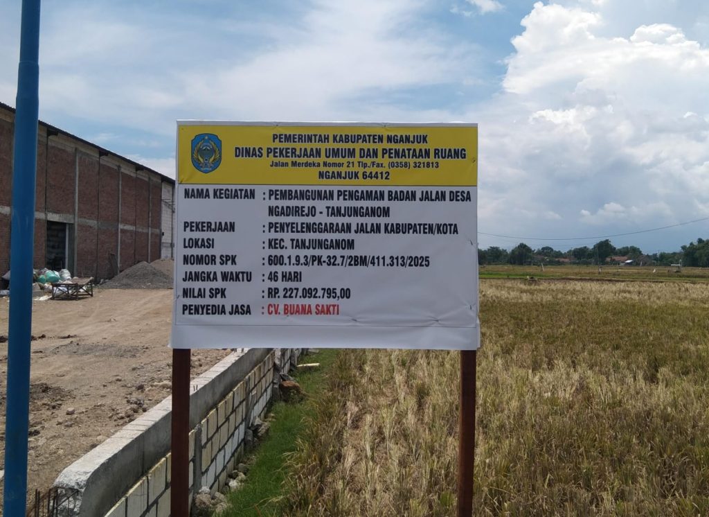 Fakta di lapangan, sesuai hasil papan nama informasi proyek pekerjaan pembangunan pengaman badan jalan Desa Ngadirejo di bawah pemangku Dinas PUPR Nganjuk dan dikerjakan oleh penyedia jasa CV. Buana Sakti dengan nilai SPK Rp.227.092.795 dengan jangka waktu masa kerja selama 46 hari kalender.