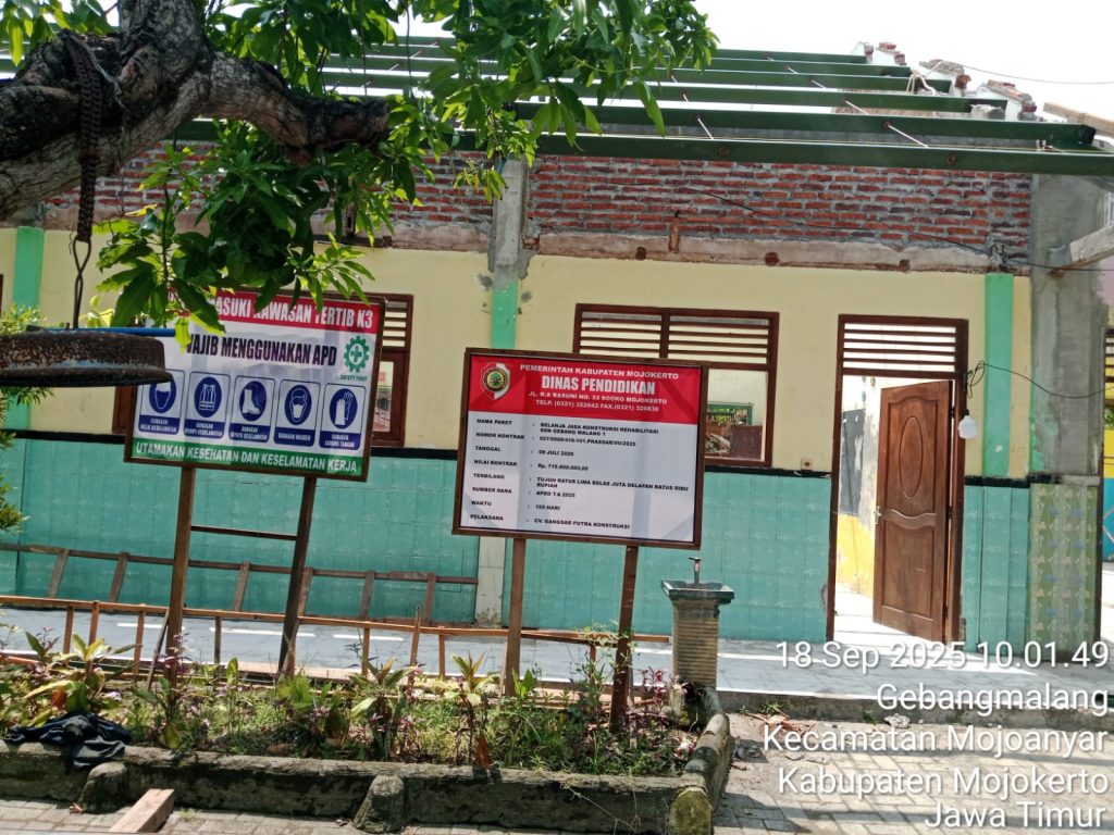 Sekolah Dasar Negeri (SDN) Gebang Malang 1, Kecamatan Mojoanyar, Kabupaten Mojokerto, Tahun ajaran 2025 – 2026 mendapatkan jasa kontruksi rehabilitasi dari Dinas Pendidikan Kabupaten Mojokerto senilai Rp. 715.800.000,00.