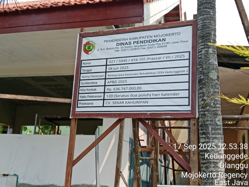 Perlu di informasikan, dalam bantuan rehabilitasi di SDN Kedunggede 2 tersebut tertuang dalam No. Kontrak : 027/5945) 416-101.PRASSAR/VII/2025, dengan pelaksana CV. Sekar Kahuripan. (dak/adv)